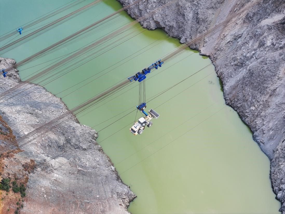 为了打通这条施工通道,项目团队决议选用缆索吊体系作为“破局要害”。在施工功率与作业适配性方面,缆索吊体系可以适配大跨度、高落差的极点施工场景,且不受库区水位季节性大幅度动摇影响,完结点对点精准运送,处理惯例设备“进不去、运不了”的中心难题。在施工安全方面,经过空中运送的方法,有用躲避险恶地势中经过地上便道运送或许面对的掉落、滑坡等危险,使设备转运与构件吊装的操作愈加可控,大幅度下降安全危险危险。在生态维护方面,作为木里岸现在仅有的机械设备及物料进出通道,缆索吊体系可高效转运施工渣土,防止渣土乱堆乱放或滚落河道,以及便道施工带来的山体大规模开挖,最大极限维护软弱的生态环境,从源头看护理塘河水域清洁与峡谷生态。